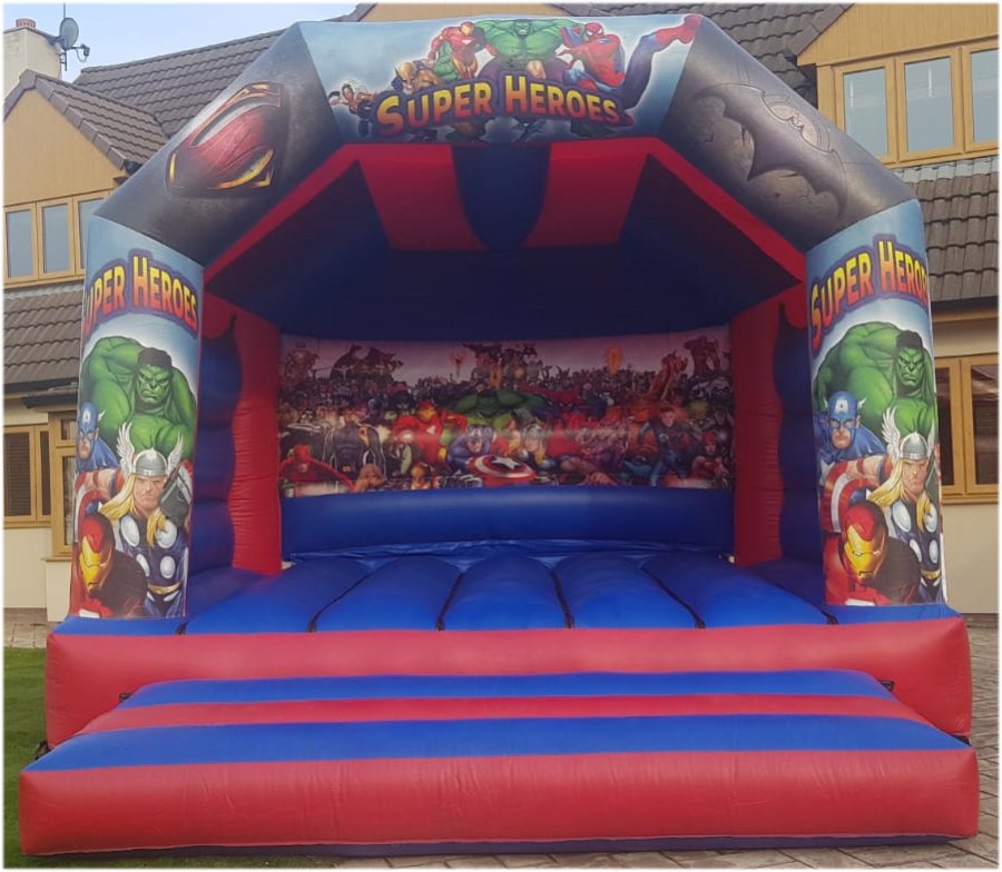 This Super Heroes Bouncy Castle is suitable for Adults and Children, has a extra deep 24" bed as apposed to the standard 20"